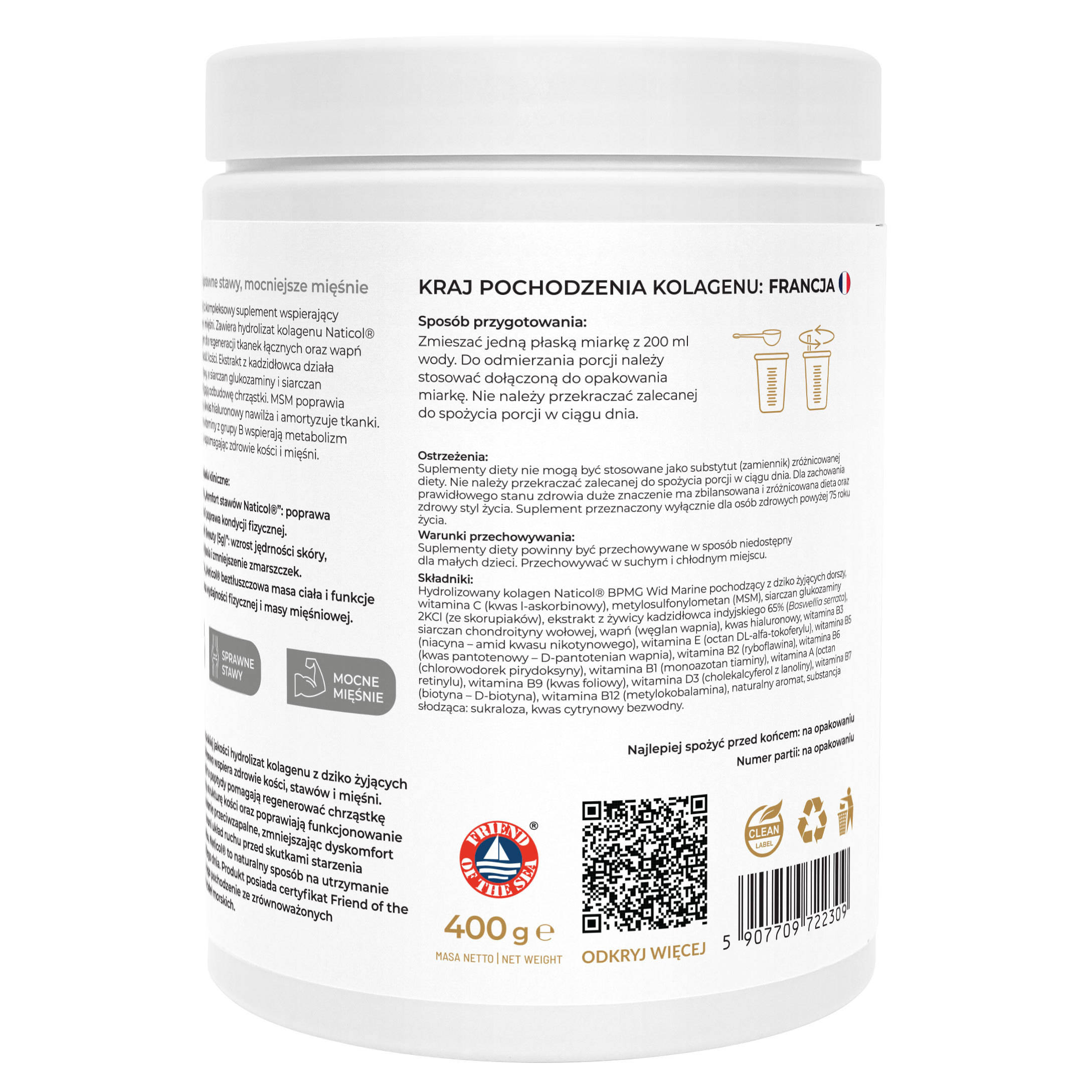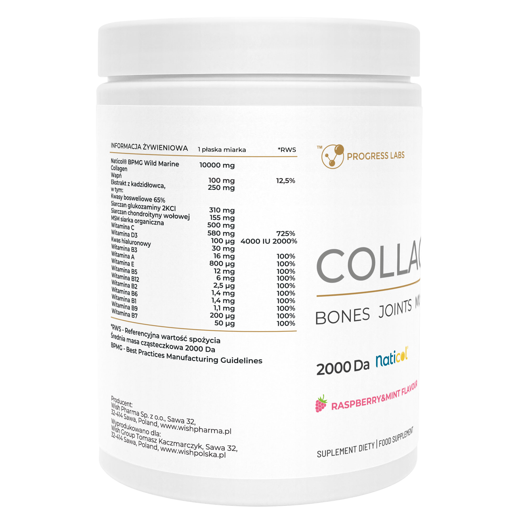 | SKŁADNIKI: Hydrolizowany kolagen Naticol® BPMG Wid Marine pochodzący z dziko żyjących dorszy, witamina C (kwas l-askorbinowy), metylosulfonylometan (MSM), siarczan glukozaminy 2KCl (ze skorupiaków), ekstrakt z żywicy kadzidłowca indyjskiego 65% (Boswellia serrata), siarczan chondroityny wołowej, wapń (węglan wapnia), kwas hialuronowy, witamina B3 (niacyna – amid kwasu nikotynowego), witamina E (octan DL-alfa-tokoferylu), witamina B5 (kwas pantotenowy – D-pantotenian wapnia), witamina B2 (ryboflawina), witamina B6 (chlorowodorek pirydoksyny), witamina B1 (monoazotan tiaminy), witamina A (octan retinylu), witamina B9 (kwas foliowy), witamina D3 (cholekalcyferol z lanoliny), witamina B7 (biotyna – D-biotyna), witamina B12 (metylokobalamina), naturalny aromat, substancja słodząca: sukraloza, kwas cytrynowy bezwodny. | ||